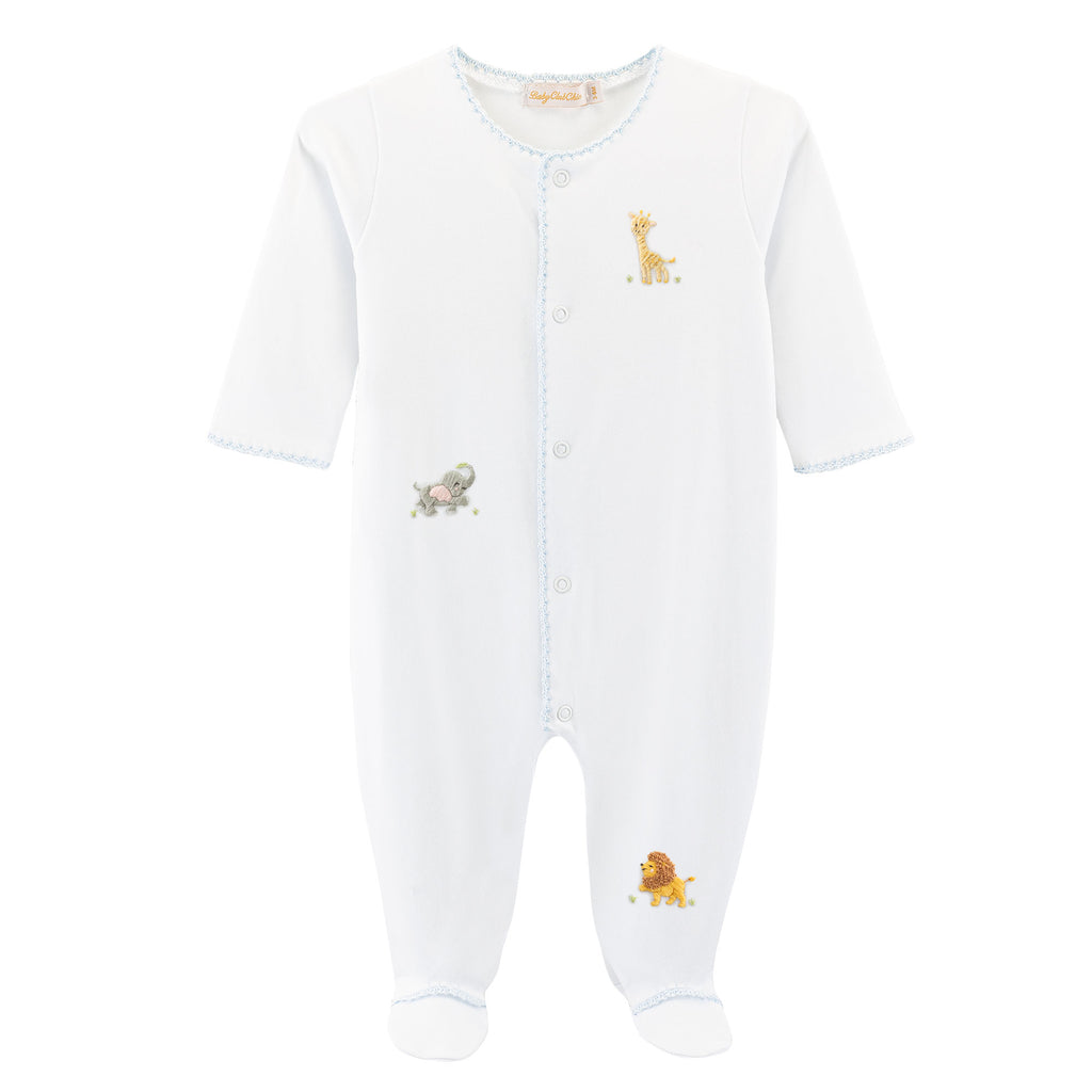 NB footie with embroidered giraffe, lion and elephant, blanket and hat